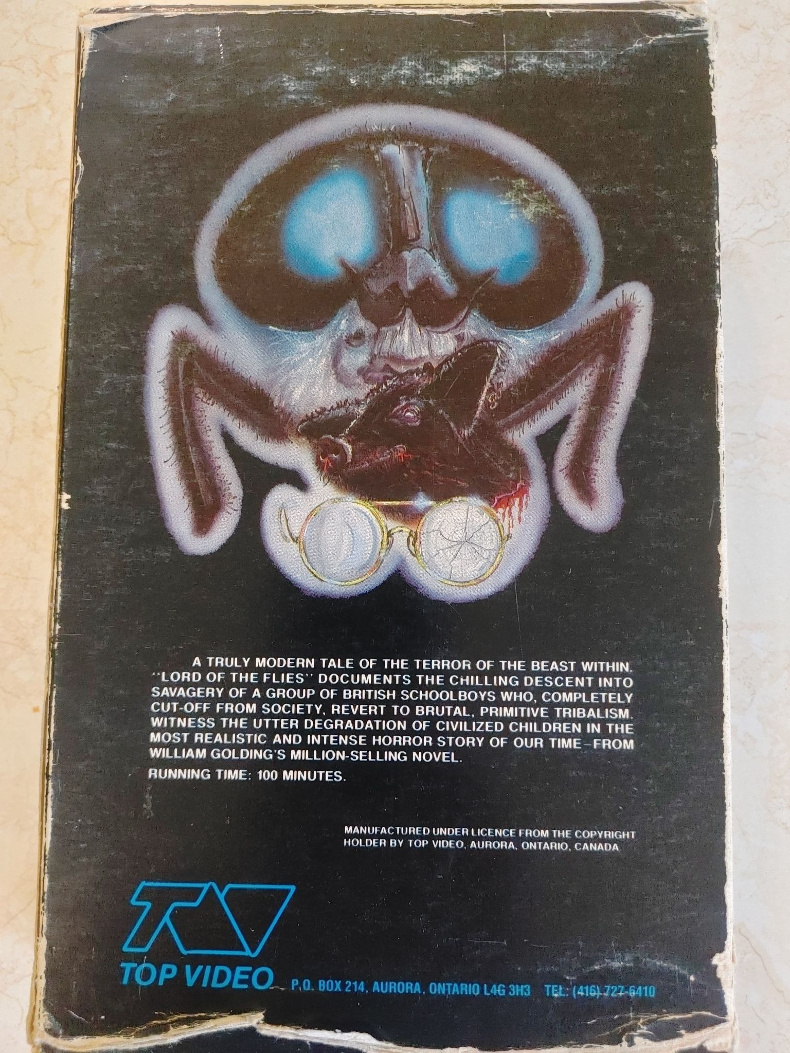 Cover is in rough shape, with creases, seamwear, stickers, and rips throughout. VHS tape has a few rental stickers. In nice shape otherwise. Big box VHS.