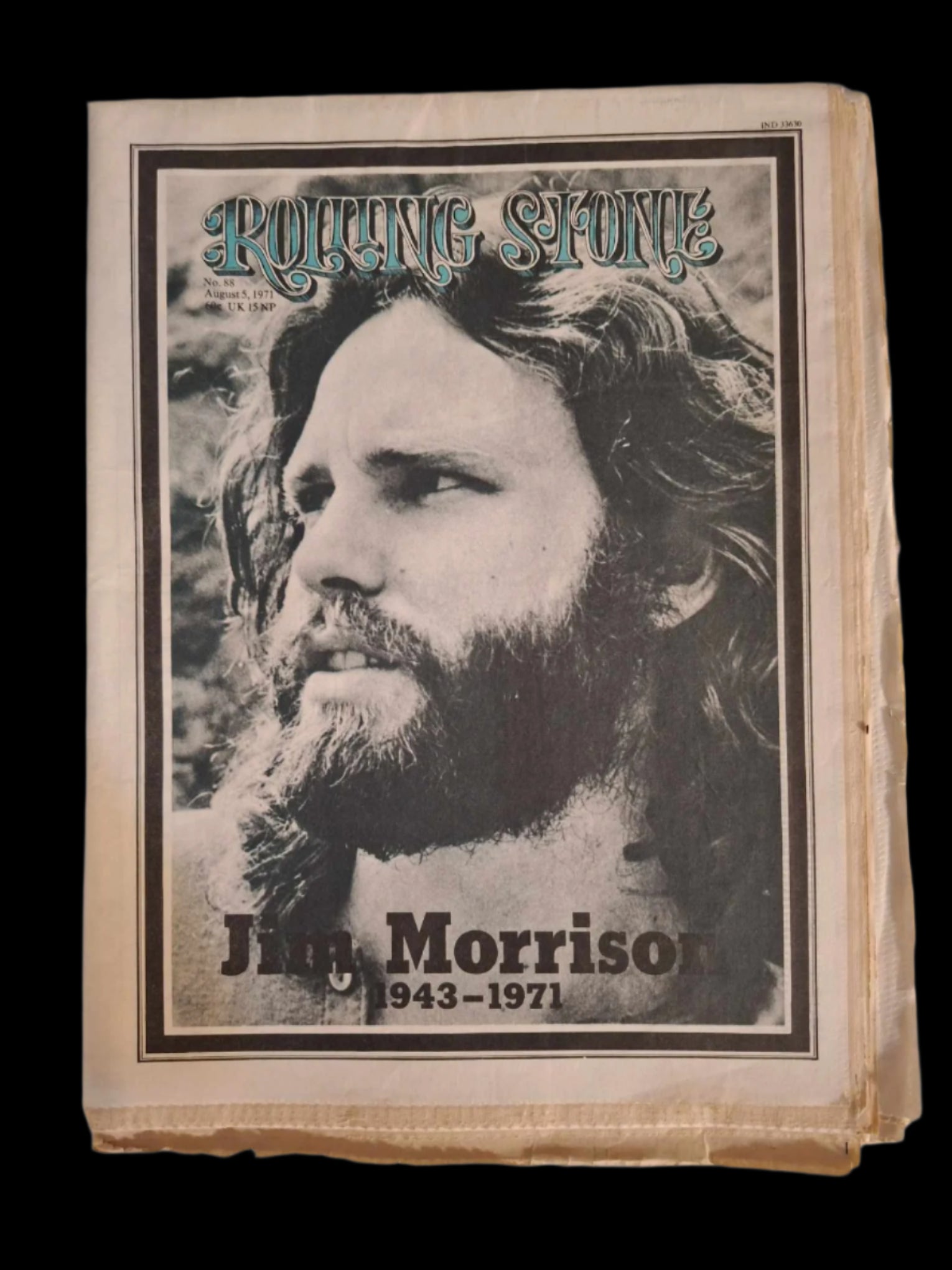This is it—the powerful and somber Jim Morrison tribute issue, published just weeks after his death in Paris. Rolling Stone Issue No. 88 is both a eulogy and a snapshot of a cultural moment the world would never forget.