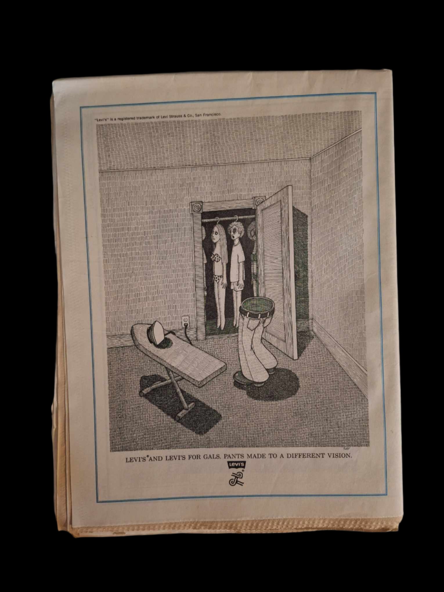 Full-page surreal Levi’s ad illustrated in underground comix style, with walking pants and closet-dwelling humanoids—a nod to counterculture absurdism