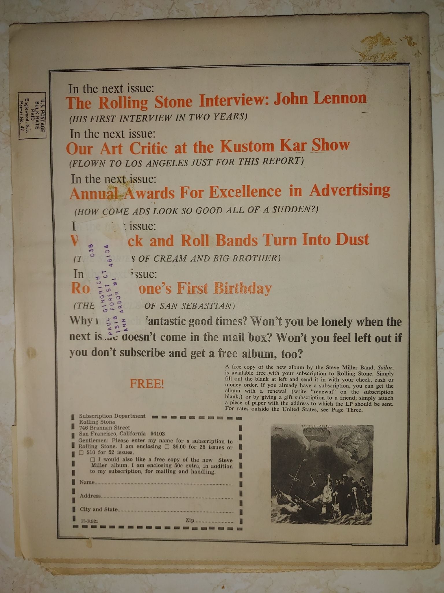 Contains yellowing to pages, tiny rips, back page has multiple stains, label, some crinkling to pack page as well. Has seen better days. Features articles on The Beatles and Muddy Waters.